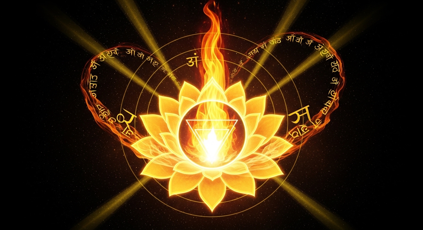 Десять лепестков Манипуры символизируют десять пран (жизненных сил) в системе хатха-йоги. Треугольник янтры вершиной вниз обозначает направление огня вовнутрь — трансформирующий, а не разрушающий жар [inferred].