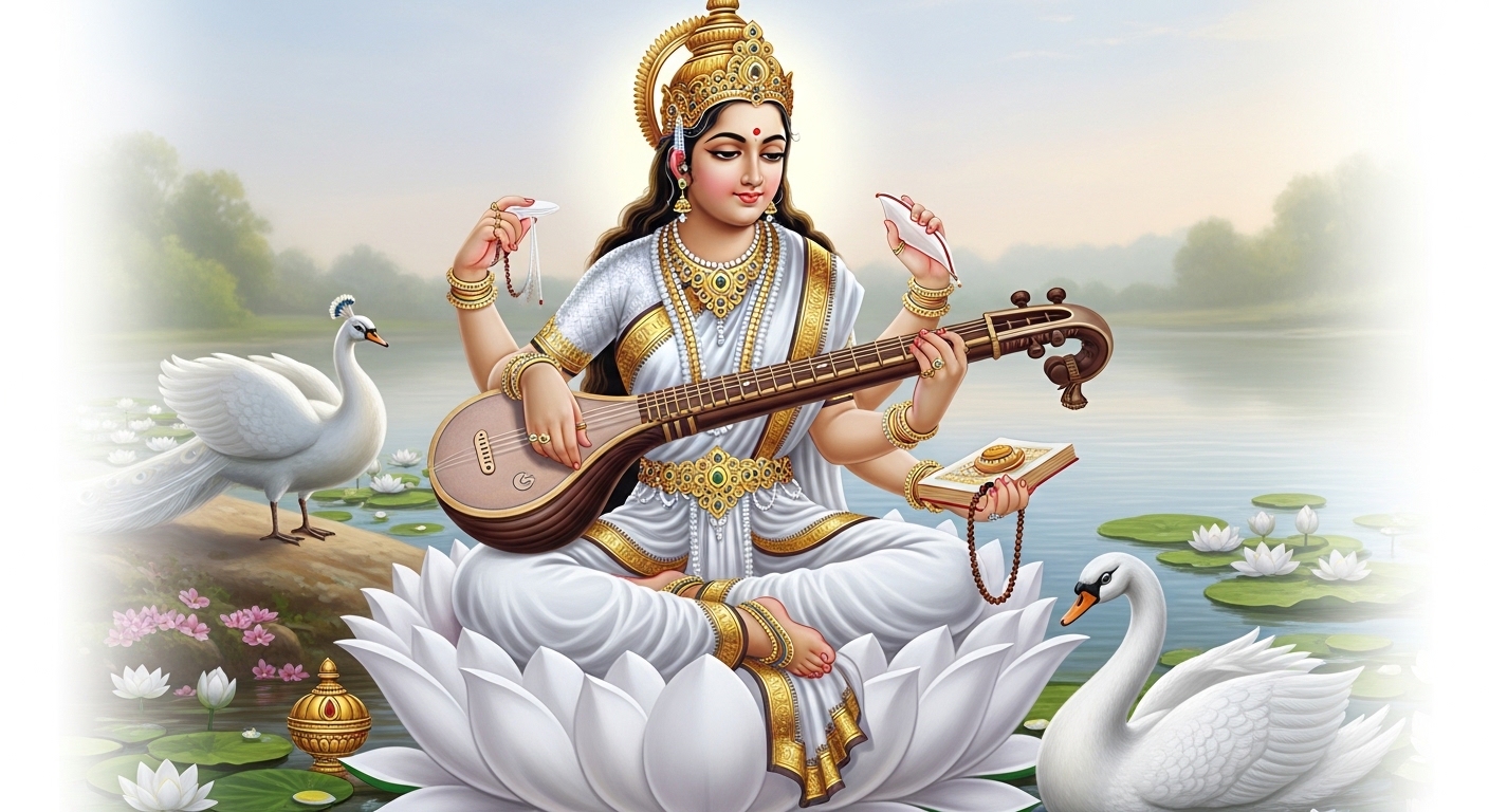 - Образ Сарасвати на белом лотосе посреди реки — спокойная, улыбающаяся, держащая вину.